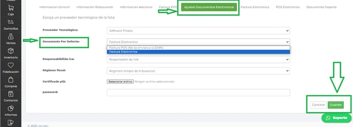 4- Luego clic en la pestaña de ajustes documentos electrónicos y selecciona el documento que quieres dejar por defecto y por último guardar.