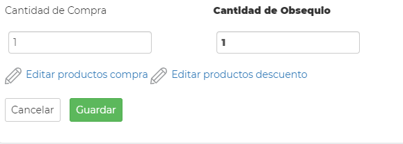 3. Edita los Productos de compra (artículos que deben adquirir para poder ser parte de la promoción) y Productos de obsequio (mercancía que regalaras)