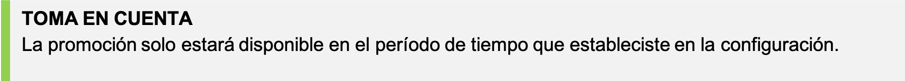 La promoción solo estará disponible en el período de tiempo que configuraste, luego de esto automáticamente se deshabilitará.