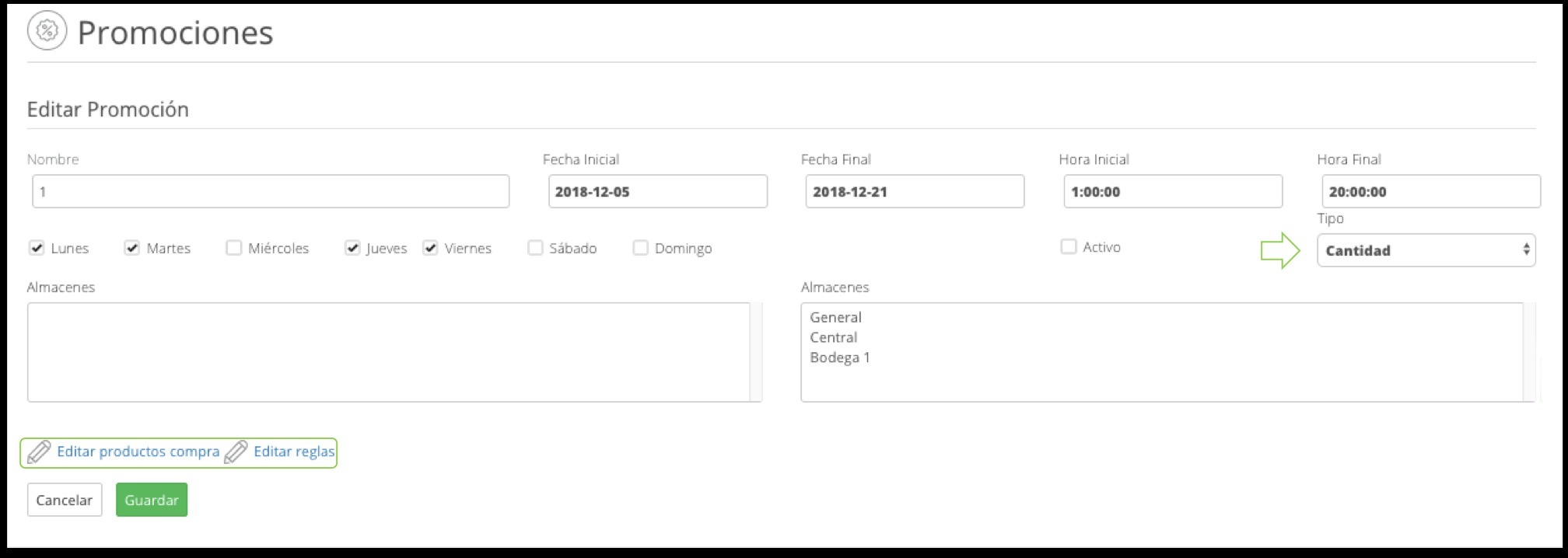 Digita los datos básicos de esta sección (los mismos que aparecen en la promoción anterior), luego en tipo escoge Cantidad y selecciona los almacenes a los que aplicará este descuento