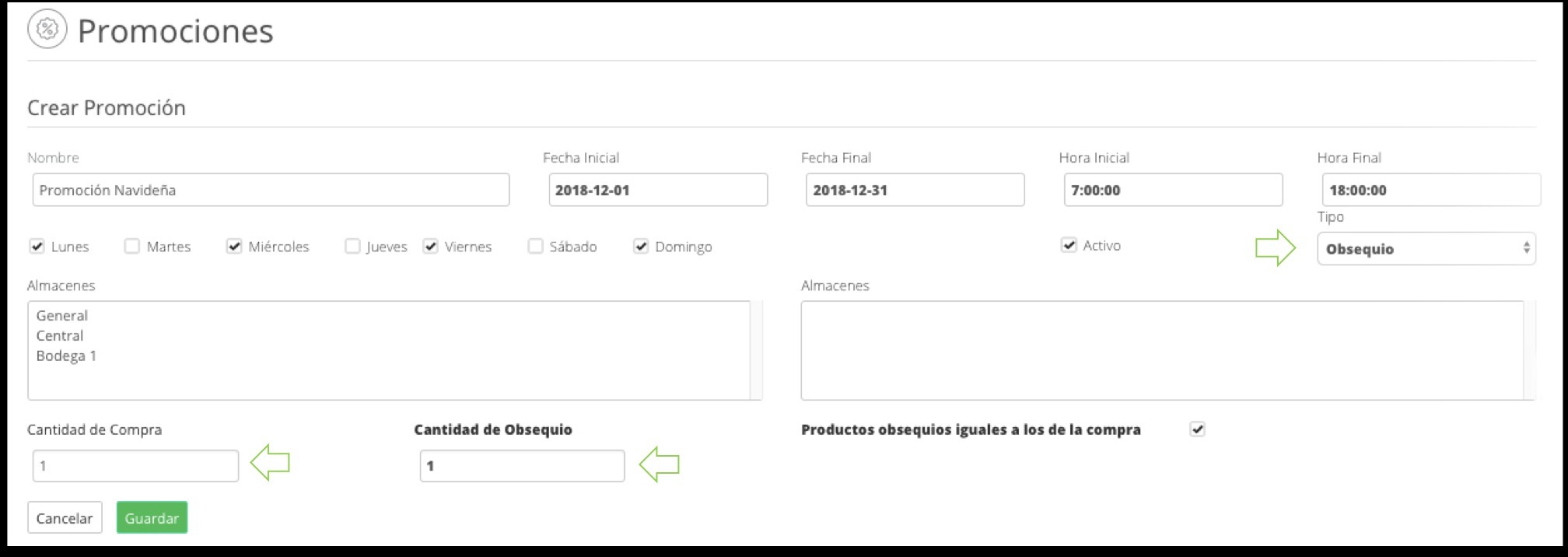 Comienza a llenar los datos básicos, en tipo selecciona Obsequio y elige los almacenes a los que aplica esta promoción