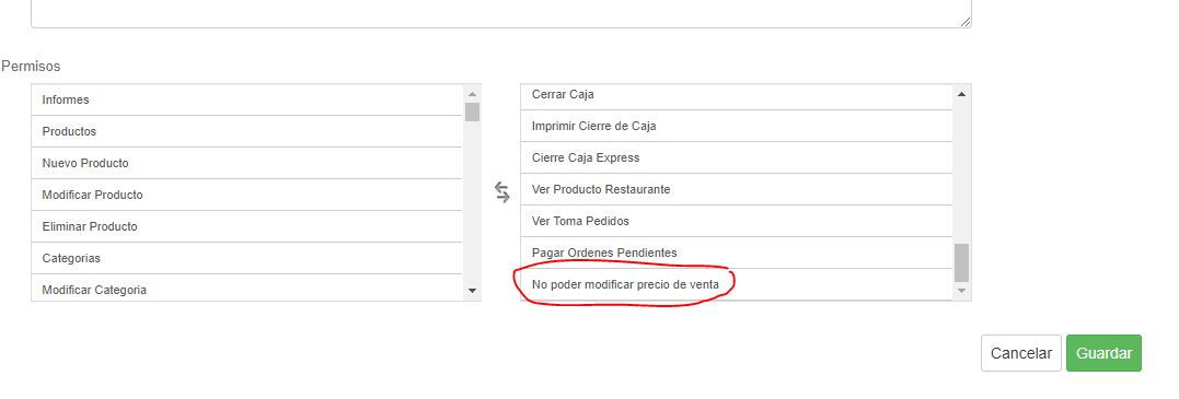 4. Debemos buscar el permiso llamado No poder modificar precio de venta que debe estar en la columna de la derecha, para que no aplique y permita modificar el precio de venta, solo necesitamos darle clic y este pasará a la columna de la izquierda a estado inactivo.