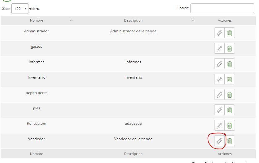 3. Debes buscar el rol que quieres editar, en este caso será el de Vendedor y le damos clic en el lápiz para editarlo.