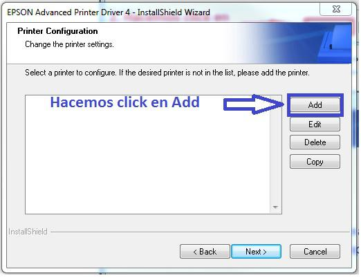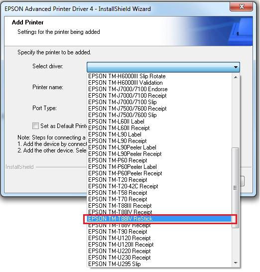 8. Ahora nos aparecerá una pantalla donde debemos agregar nuestra impresora EPSON TM, nosotros seleccionaremos como ejemplo la TM-T88V o la TM-T20II (según corresponda). Para agregarla hacemos click sobre Add.