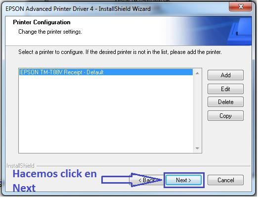 11. En esta pantalla nos aparece la impresora con la configuración seleccionada. Hacemos click en Next.