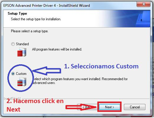 5. Seleccionamos la segunda opción CUSTOM y seguidamente hacemos click en Next.