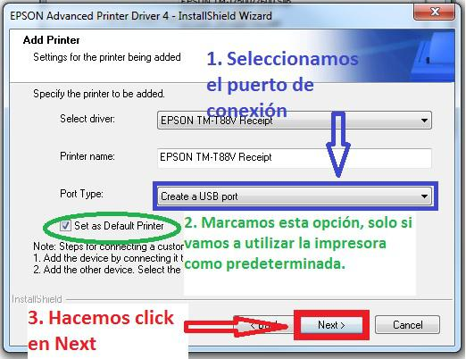 10. Una vez seleccionado el modelo de la impresora que tenemos, como por ejemplo la Epson TM-T88v,(aquí seleccionas la impresora que tengas si es la TM-T88v o TM-T20II) toca configurar el puerto de conexión a PC. Nosotros como ejemplo utilizaremos el puerto USB. No olvides marcar la casilla «Set a Default Printer» si quieres utilizar esta impresora como predeterminada en el sistema, y hacemos click en Next.