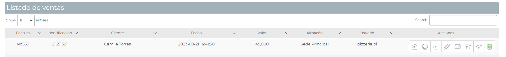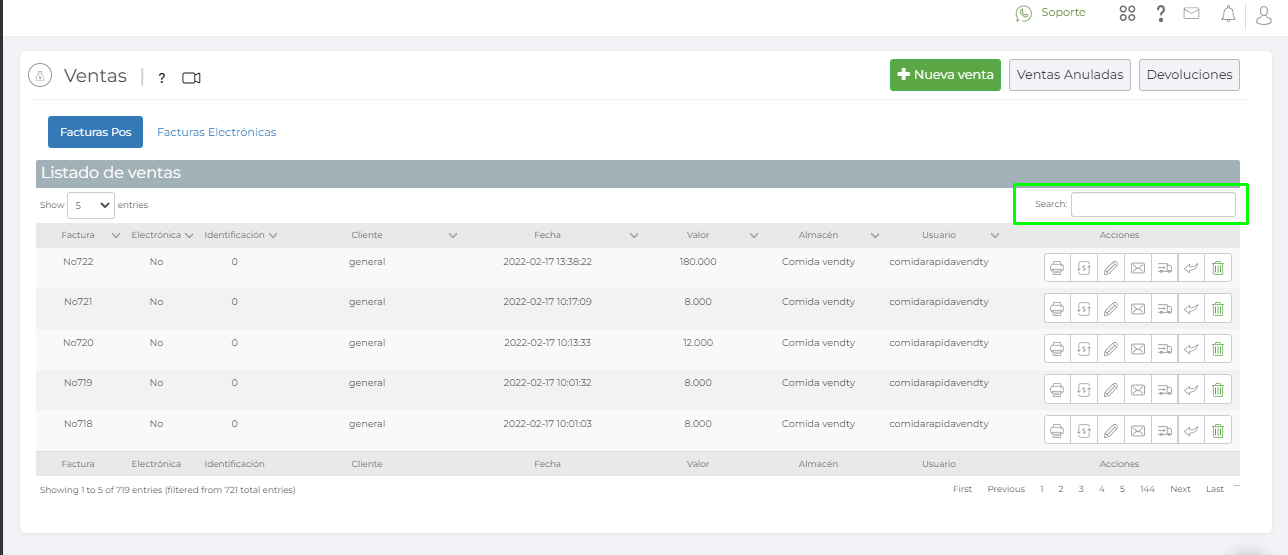 3. Si deseas buscar una, solo debes colocar el consecutivo o el nombre del cliente y esta aparecerá. Desde acá puedes hacer diferentes funciones como reimprimir, enviar por correo electrónico, una guía de despacho en caso de envíos, realizar una devolución de productos o anularla