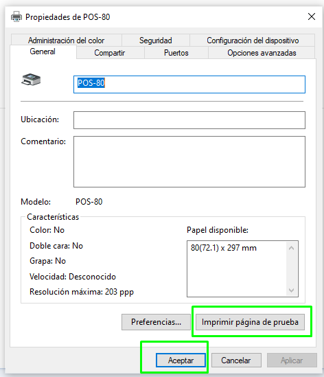 - Una vez ingrese a "Propiedades de la impresora" daremos clic en imprimir página de prueba para verificar el estado de la impresora, si esta imprime, ya tendremos la impresora en conexión con el sistema.