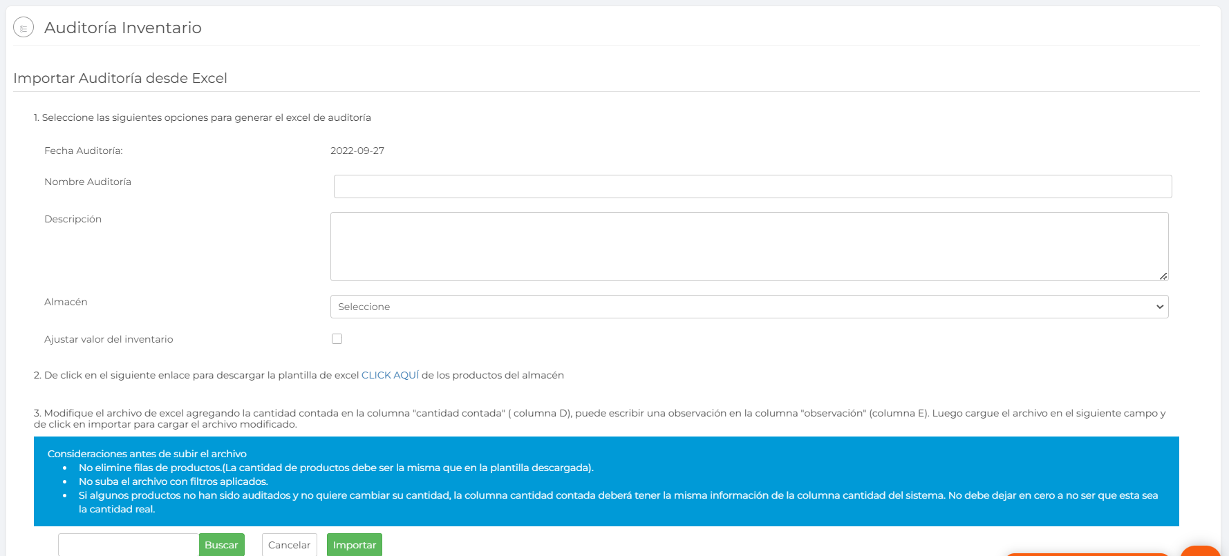 En caso de tener muchos productos que auditar. Puedes hacerlo a través de un Excel, esta es la más rápida y fácil de hacerlo, ya que se te descargará un documento con todos tus productos y debes colocar las cantidades y observaciones de cada uno.