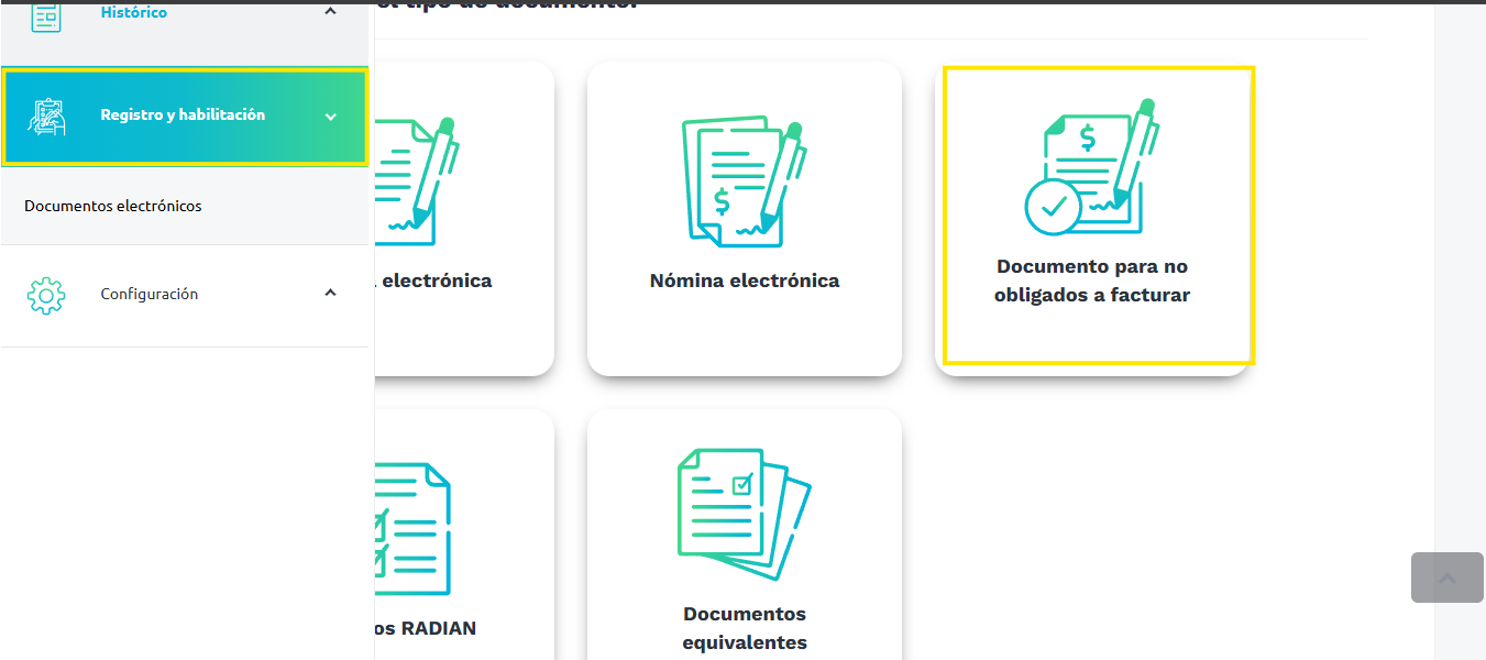 Se dirige al panel de registro y habilitación > documentos electrónicos y luego clic en documentos para no obligados a facturar.