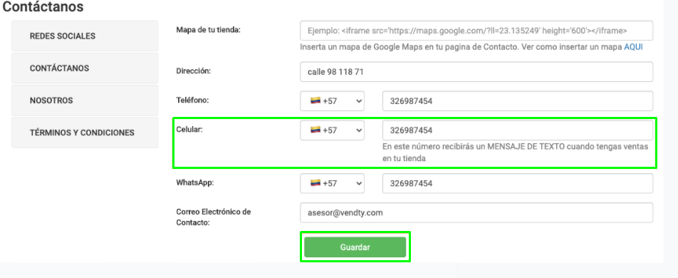 Solo debes agregar el número de celular del negocio ingresando al módulo de "ventas" y luego damos clic en "Contáctanos".