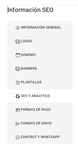 2. Da clic al módulo de Ajustes y luego ingresa a la pestaña de SEO Y ANALYTICS