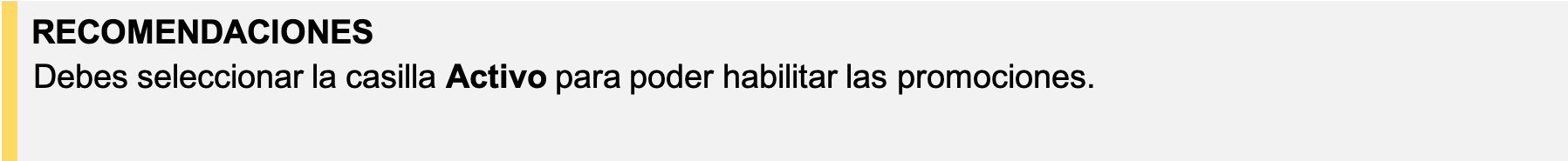 En caso de que una promoción no aparezca en el módulo de ventas, debes revisar que la casilla Activo esté habilitada