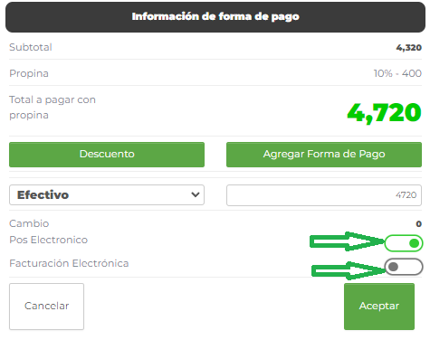 Al momento de pagar se debe activar (color verde) el botón de facturación electrónica o pos electrónico, depende cuál tengas seleccionada por defecto. Si este no se activa, la factura no se creará.