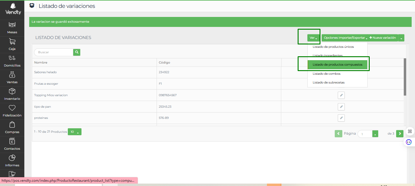 5. Luego de creada la variación, dirígete a Ver > Listado de productos compuestos y busca el producto compuesto al que deseas asociar la variación.