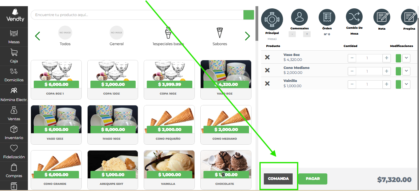 Selecciona los productos solicitados por el cliente y haz clic en Comandar para enviar el pedido.