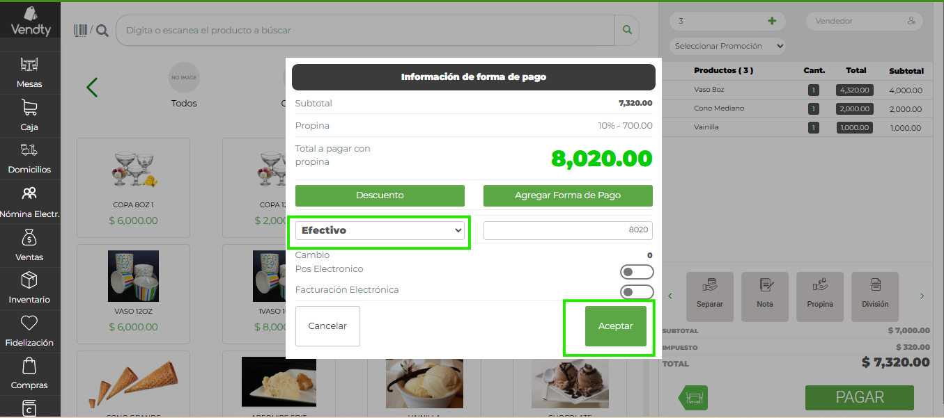 Selecciona la forma de pago que corresponde y confirma con Aceptar.